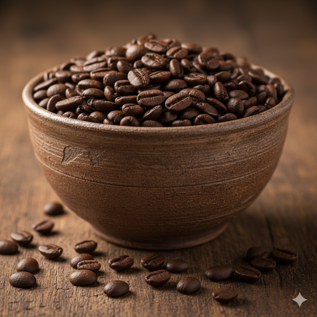 دانه قهوه ربوستا چری با طعم قوی، تلخ و پربدنه؛ مناسب اسپرسو، قهوه ترک و ترکیب با عربیکا برای کرمای بیشتر.